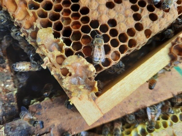 Gisteren heb ik een paar dadantkasten gecontroleerd en inmiddels hebben de moeren de middelste twee oude ramen bijna volledig belegd (samen 16.000 toekomstige jonge bijen). De kunstraat aan weerszijden wordt ook goed uitgebouwd en binnenkort belegd. Over twee weken kunnen de miniplus randjes verwijderd worden want dan is het broed in de miniplussen uitgelopen. Tot zover verloopt het goed. De spaarkastramen worden iets minder bezet vanwege de ontbrekende twee uitgebouwde ramen in het midden. Maar over een week zijn ze ook zo ver.