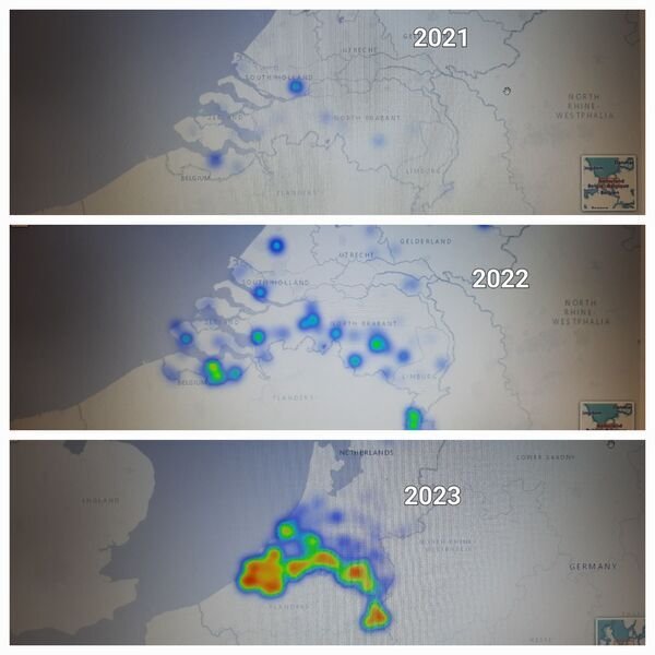 Wanneer je de op waarneming.nl goedgekeurde meldingen van de Aziatische hoornaar van de jaren 2021, 2022 en 2023 met elkaar vergelijkt, dan slaat de schrik je om het hart. Het aantal nesten vertienvoudigt zich ieder jaar. Het is zaak dat we als imkers, insectenliefhebbers en fruittelers de handen ineen slaan en de bedreiging proberen te verminderen.