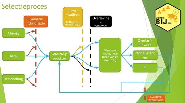 In het schema hieronder zie je hoe het project werkt. Er worden koninginnen gekocht of larfjes gehaald om zelf koninginnen van te telen. Allereerst moeten deze volken zonder enige vorm van behandeling de winter doorkomen. In het voorjaar erop zullen deze volken potentiële darrenvolken zijn. Daarvoor worden de darren via DNA getest en moeten een score van 90% kans voor Zwarte bij (of meer) hebben om door te mogen gaan. De grens van 90% probability wordt internationaal aangenomen als een zuivere score. Ook worden de volken getest op zachtaardigheid en goede voorjaars-ontwikkeling. De volken worden dan opgekweekt om darren te leveren voor de bevruchting van jonge koninginnen op de paringsstand.