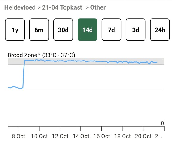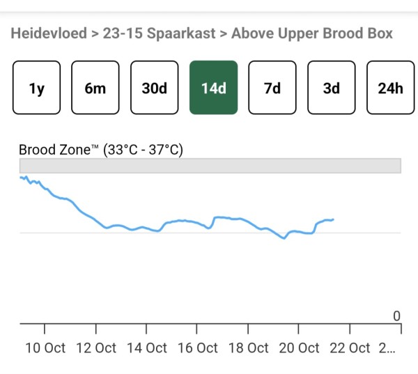 In de video gemaakt op 9 oktober (zie linker grafiek) plaats ik een temperatuursensor in een topkast. Hierin zit net een jonge F1 van dit jaar. Hieronder links zie je dat dit volk nog steeds broed heeft in tegenstelling tot het volk in de spaarkast met een moer van ruim twee jaar oud, die al uit het broed is. Een jonge moer broedt dus langer door en geeft betere kanse op een goede uitwintering. Het rechter volk is het volk waarin de asrrestbak gezeten heeft. Deze is dus omstreeks begin oktober uit het broed gegaan.