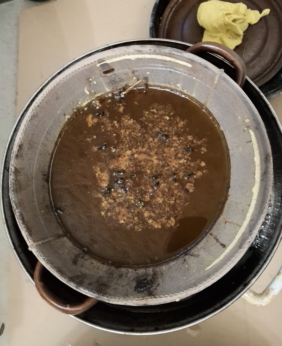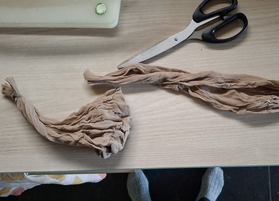 In de wasblokken zitten vaak nog de nodige ongerechtigheden, zoals dode bijen en wespen, die gefilterd moeten worden. Daarvoor gebruik ik zoals je op onderstaande foto's kan zien een WECK-ketel met daarin een oude emaille pan. Over de pan span ik een nieuwe goedkope pantybroek - met de schaar ontdaan van de "benen" - en daarop komen de wasblokken te liggen aangevuld met zegeltjeswas.