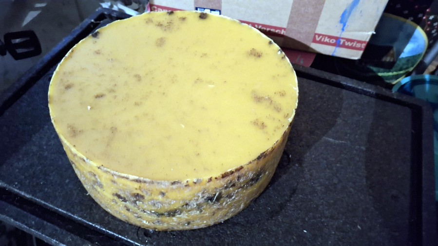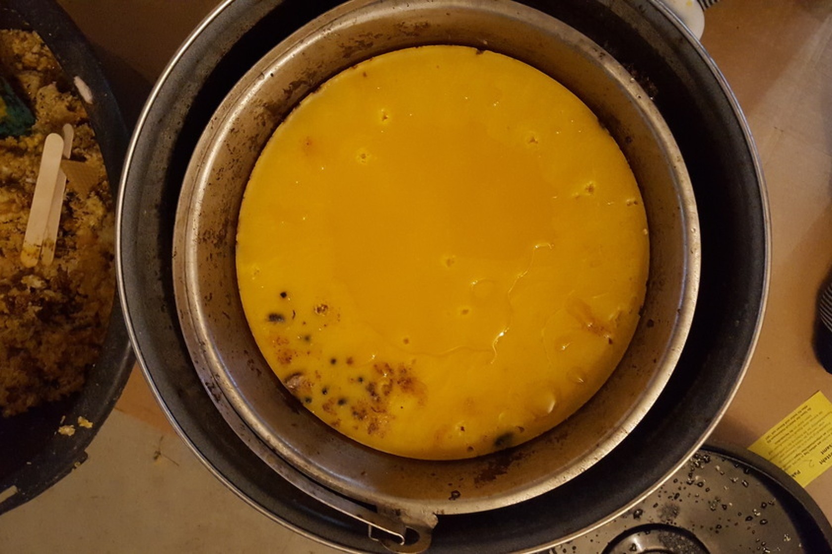 Na 4 uur au bain marie verwarmen met water van ongeveer 80 graden in de WECK-ketel en een laagje water in de emaillepan kun je de pantybroek met alle ongerechtigheden eruit nemen en de volgende morgen is alles afgekoeld tot een mooi blok was van ongeveer 5 a 6 kilo. Dit blok kun je aan de onderkant nog afkrabben zodat er een mooi blok was ontstaat. Voor de externe verwerking tot kunstraat hoeft het niet zo schoon te worden als voor het zelf gieten van kaarsen. Uiteraard wel een keer extra filteren wanneer jezelf kunstraat wil gieten.