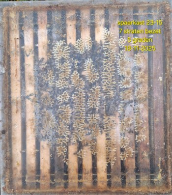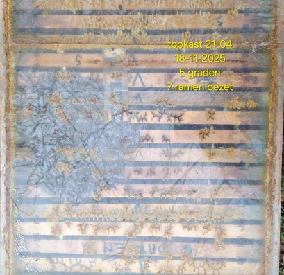 Vanmorgen was het aan de grond behoorlijk koud. Rond Groningen was het min 9 graden op klomphoogte. In het hele land met uitzondering van het westen van Zeeland vroor het aan de grond. De bijenvolken lijken gezien de weersomstandigheden stabiel op de wintertros te zitten. Bijenvolken reageren echter snel op externe omstandigheden, dus bij een temperatuurstijging richting de 8 graden overdag verlaten ze de trosvorm weer en halen ze het buitenste wintervoer weer naar het centrum van het volk.