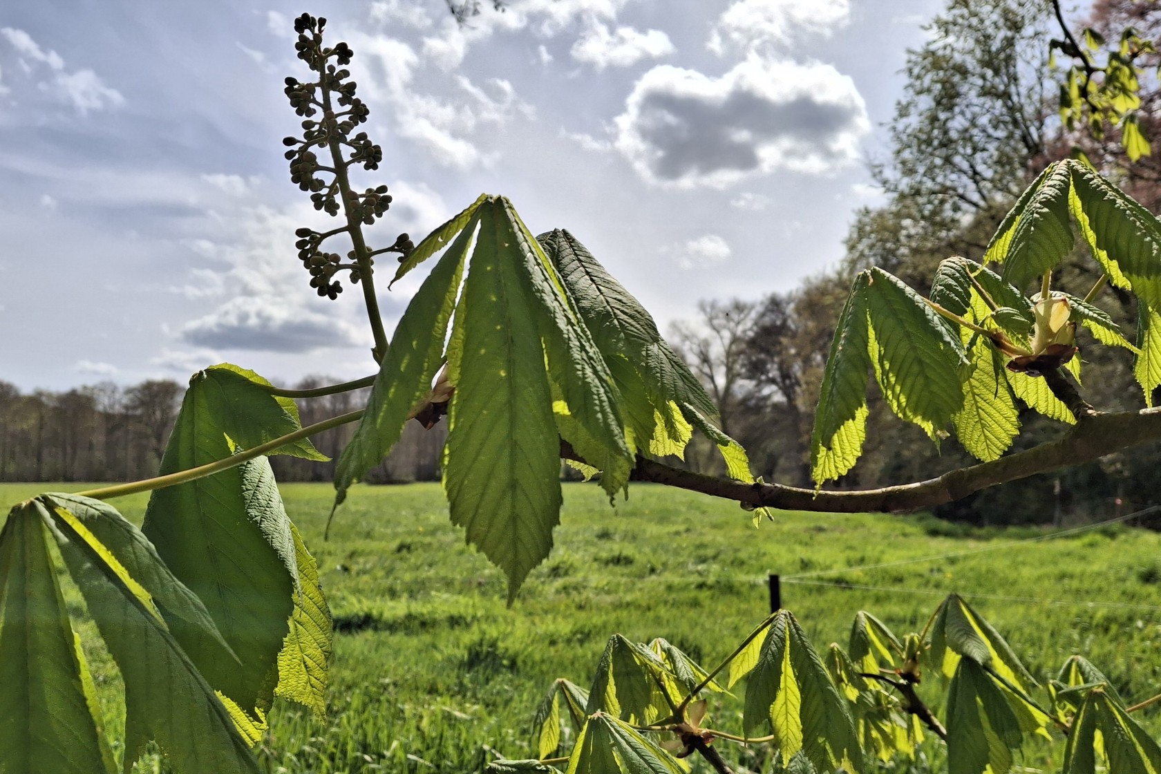 Foto: de Paardenkastanje maakt zich ook op om te gaan bloeien. Let eens op het rode stuifmeel, dat van deze bloemen afkomt.